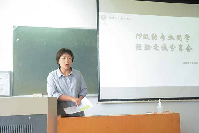 分享会根据不同专业在四个教室同时进行。18中教5班何蒋滢在与同学们分享了自己转专业后的学习生活后,提示同学们要学会充分利用时间,制定学期目标,有计划地学习,并表示释放压力也是学习生活中的重要部分;18中文1班吴若兰指出,同学们来到新的学院需要学会调节心态、适应环境,鼓励同学们追寻热爱的事物,在学习成绩优异的基础上提高竞赛成绩;18历史班张宏一建议同学们在完成专业课学习的同时要补充课外知识,向同学们介绍了部分学院活动,鼓励同学们积极参与,把握机会,拓展自身各方面的能力;18思政2班李雪雯则为同学们分析了思想政治教育专业的课程结构,提出要注重专业学习,利用课余时间提高自己的师范生技能。
