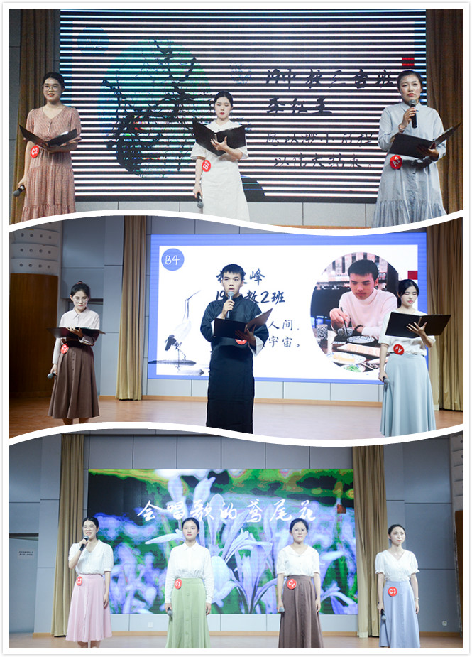 比赛在精心制作的开场视频中拉开帷幕。主题朗诵环节,“四季春玛奇朵战队”别处心裁地将椅子元素融入舞台表演,使舞台画面自然而丰富。“我真的很不错战队”以“在心的旷野呼喊”为主题,通过演绎穆旦组诗,展现了对山河破碎的国家深切的爱与痛惜。而“C位出道队”以“你好,青春”为主题,借《追梦者》《致橡树》等诗歌歌颂了美好的青春、爱情与梦想。车轮战环节开始后,比赛进入白热化阶段,相同序号的每组选手同台竞技,展现出不同风味的《沁园春·长沙》《乡愁》《饮酒》《我爱这土地》。演诵环节中,每个团队依据自身特点和优势,选择了三首风格截然不同的诗篇,精彩的朗诵将比赛推向高潮。为缓和比赛紧张激烈的气氛,线上线下特设抽奖环节,同学们欢声笑语不断。经过激烈的角逐,最终“C位出道队”荣获一等奖,“我真的很不错队”获二等奖,“四季玛奇朵队”获三等奖,19中文1班李显清获本场比赛最佳个人奖。