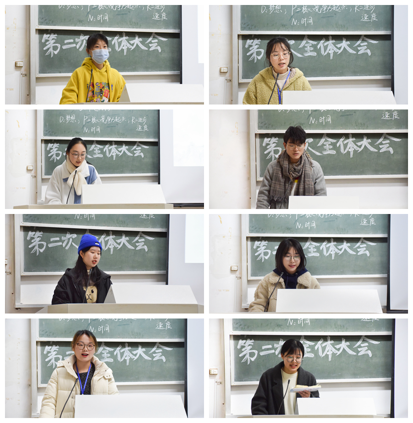 本次大会分为老师致辞、部门工作汇报和主席团总结三个环节。会议伊始,夏老师向过去一个学期辛勤付出的所有员工干部表达了衷心的感谢,在广老员工干部的共同努力下,学院各项工作都取得了新进展。接着,他从“活动开展”“队伍建设”“规范制度”三方面总结了本学期的团学工作的开展情况。在谈到员工干部应如何应对学习和工作中出现的焦虑情绪时,夏老师分享了《五种时间》一书中提到的梦想成真硬核人生公式,他认为“焦虑是一种正常的心理状态,解决焦虑的关键,不是克服焦虑的情绪,而是解决让你焦虑的事情”。最后,夏老师勉励全体员工干部,要干在实处、走在前列,奋力开创新时代9428cn太阳集团古天乐共青团事业新局面。