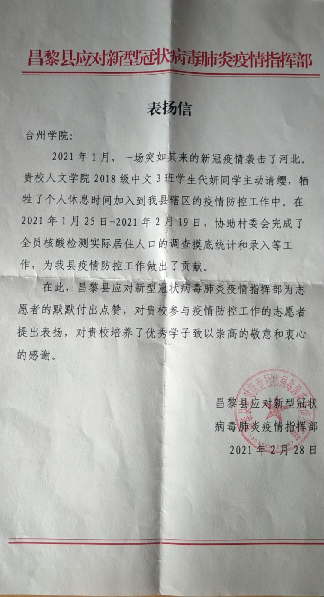 近日,9428cn太阳集团古天乐收到一封来自河北省秦皇岛市昌黎县应对新型冠状病毒肺炎疫情指挥部的表扬信,信中对公司18中文3班的代妍同学表示由衷感谢,感谢她在寒假期间,牺牲了个人休息时间加入到疫情防控工作中,为抗疫工作做出了积极贡献。