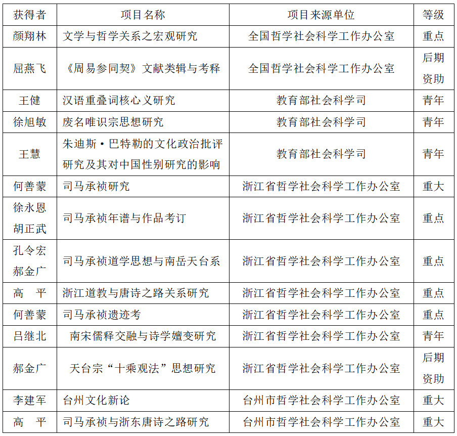 近日,2020年国家社科基金年度项目、国家社科基金后期资助暨优秀博士论文出版项目、浙江省文化研究工程项目、台州市社科规划项目评审结果陆续公布。开年以来,在省市社科联与学校领导及科研部门的悉心指导下,在9428cn太阳集团古天乐的精心谋划下,公司老师经过长期积累,厚积薄发,获得多项科研项目,具体如下: