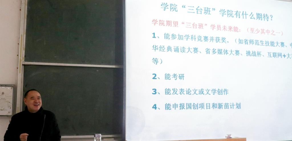 活动伊始,李跃华副经理详细介绍了“三台班”的人才培养计划,他指出“三台班”是对接基础学科拔尖人才培养计划,培养具有深厚文化底蕴、精湛教学技能、较强科学研究能力和文学创作能力的创新型高素质人才的班级。“三台班”实行导师制和小班化管理,为同学们提供专项经费和固定的实践实训场所等保障机制。李跃华副经理对未来的“三台班”学员给予期许,他希望同学们能够积极参与学科竞赛、创新创业、文学创作、考研等,在各项研学活动中不断提升自己各方面能力,完善自我。活动尾声,李跃华副经理向同学们讲解了“三台班”选拔机制,并鼓励大家积极参加,抓住机遇,树立目标,提高专业能力。