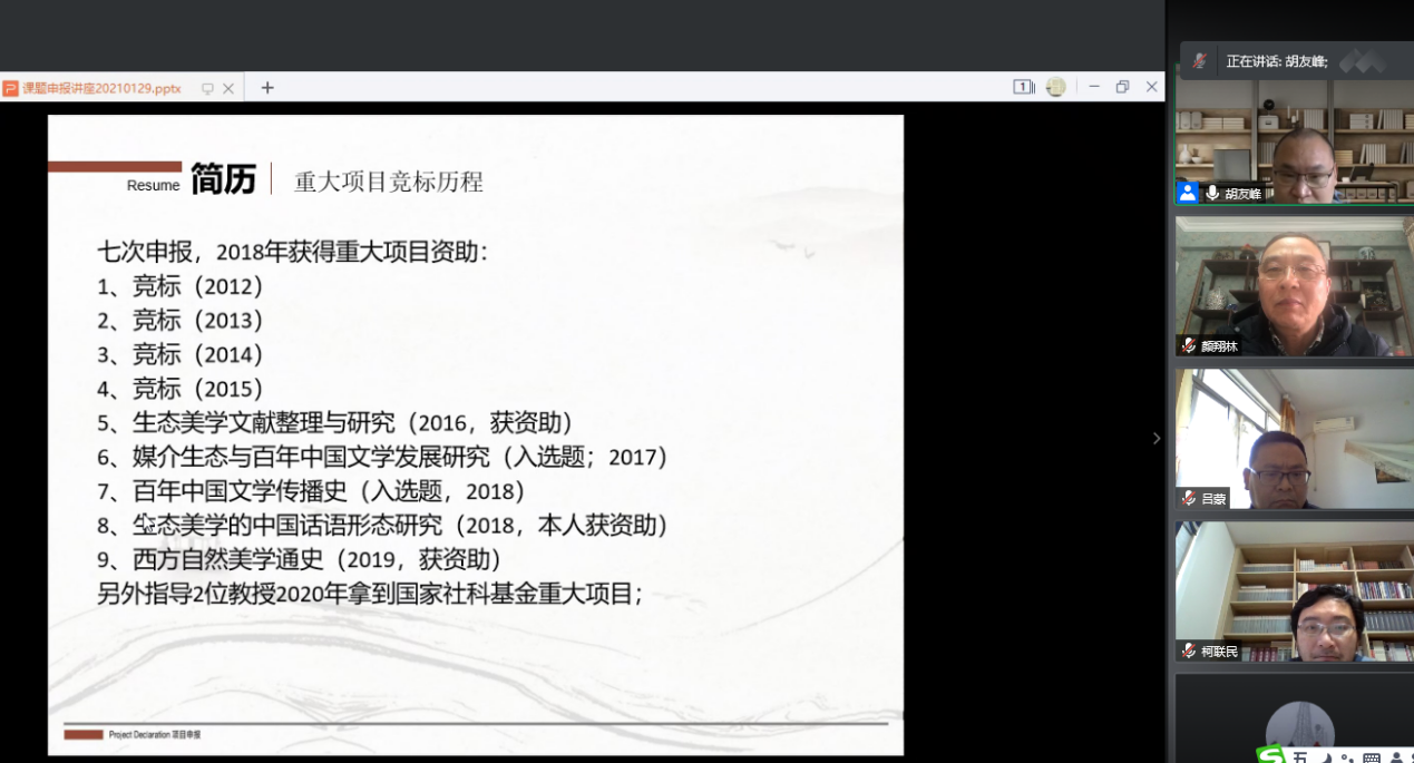 为做好公司2021年度国家社科基金项目的申报工作,切实提高公司教师科研项目申报质量,学院于2月3日下午邀请山东大学文学院胡友峰教授通过腾讯会议的方式为教师们作国家社科基金项目申报指导讲座。讲座由陈隆升副经理主持,李建军经理及其它老师20余人出席了此次线上讲座与交流。