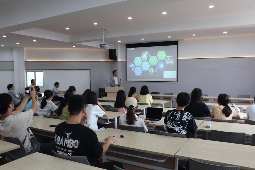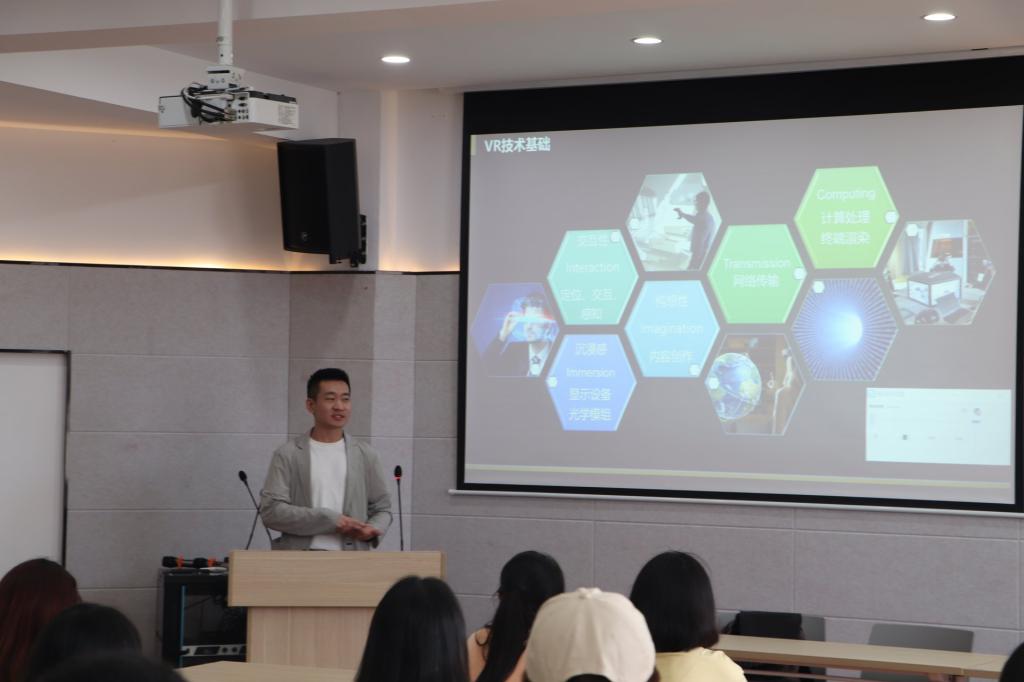 会议伊始,贾凌宇经理从电影《头号玩家》中的VR头盔入手,向同学们介绍了VR技术中的“3I”特性——沉浸感、交互性、共享性,以及VR技术在文科与理工科中得到广泛应用的现状。随后,贾经理从已有案例出发,向同学们展示了VR技术在人文历史、休闲旅游、艺术设计、经管类专业等方面的实验与应用,使同学们在了解VR技术在国内各个行业的开发成果后,更加深刻地体会到我国虚拟现实技术发展的先进性与卓越性。