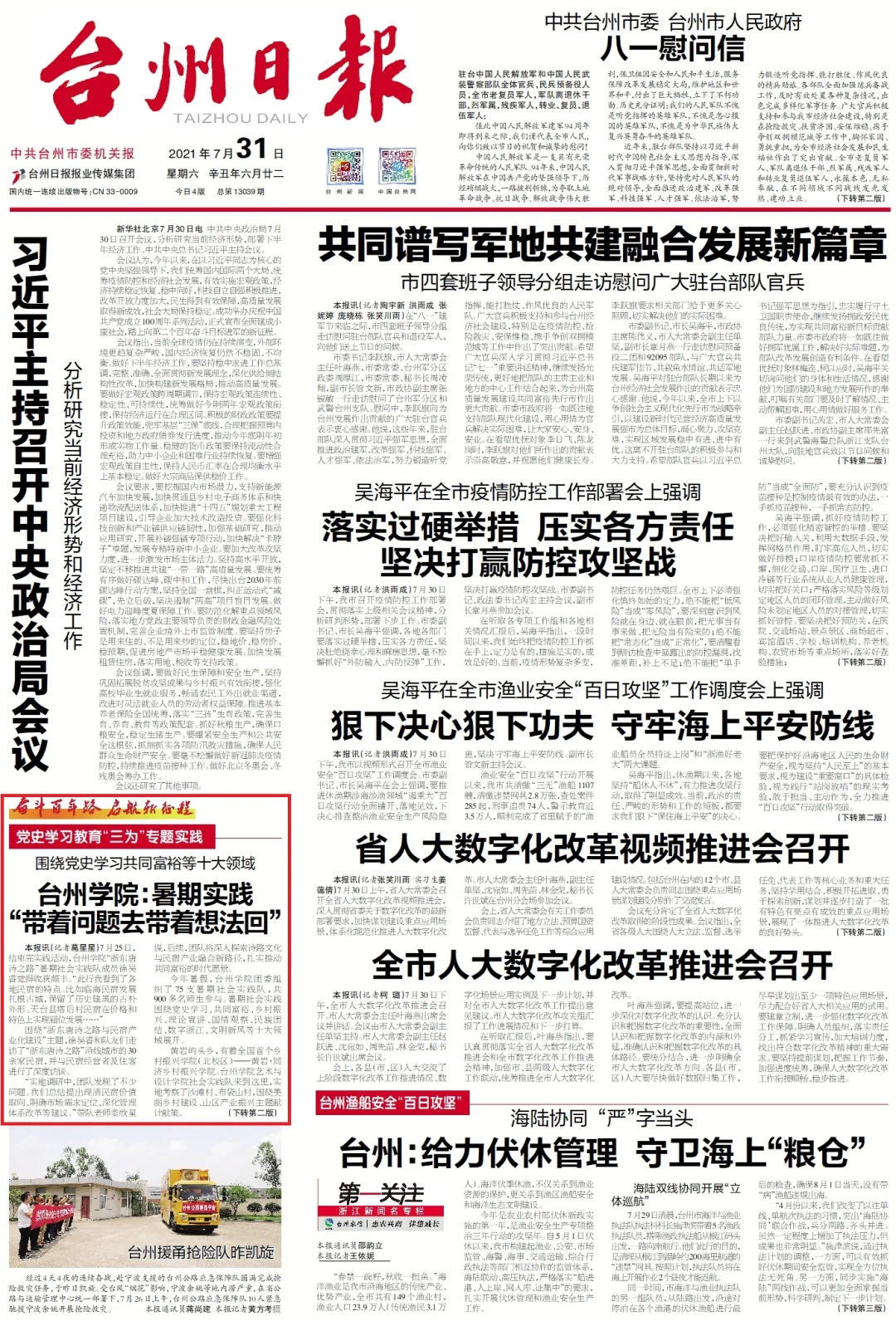 台州日报头版报道,为响应国家乡村振兴战略,助力浙江省高质量发展建设共同富裕示范区,落实“带着问题去 带着想法回”的实践目标,7月5日至12日,9428cn太阳集团古天乐“浙东唐诗之路”实践队在娄欣星、王宏芹老师的带领下,围绕“浙东唐诗之路与民宿产业建设”主题,赴绍兴、台州等地开展调研。