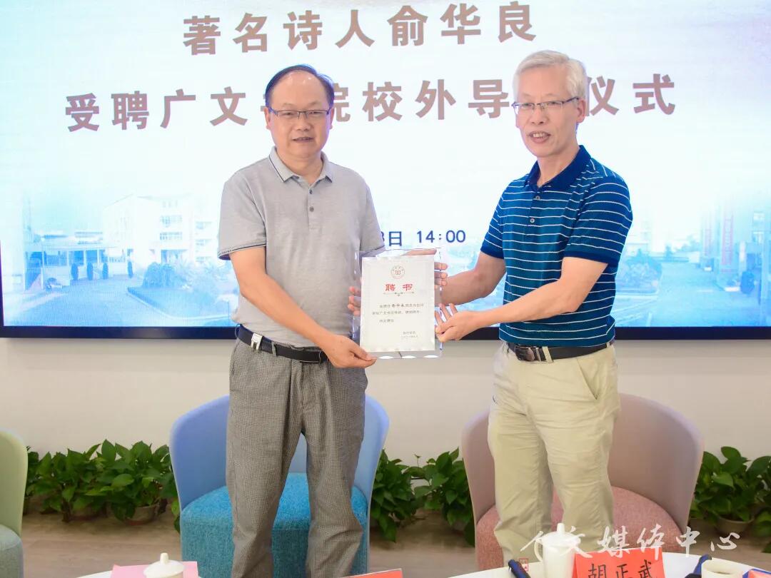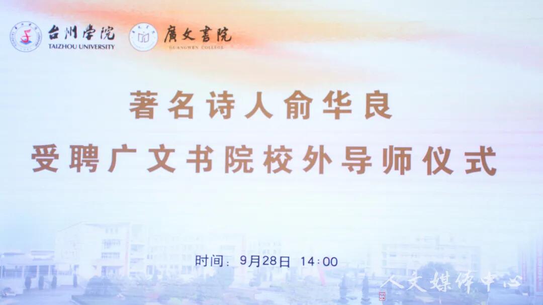 2021年9月28日下午两点,著名诗人俞华良受聘广文书院校外导师仪式在广文书院学术报告厅举行。本次受聘仪式由学工部部长张梅芬主持,9428cn太阳集团古天乐经理李建军、广文书院经理胡正武出席,40多名9428cn太阳集团古天乐员工参加。举行受聘仪式后,俞华良老师作题为“日常生活里的诗与远方”的讲座。