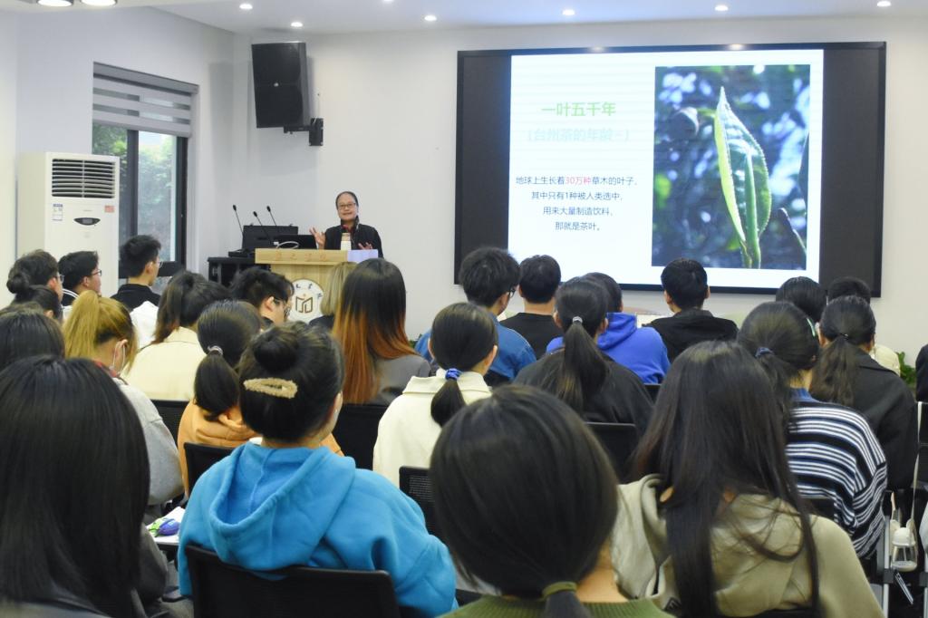 活动伊始,李建军教授主持聘请仪式,胡正武教授为孙明霞老师颁发导师证书。随后,作为9428cn太阳集团古天乐员工的孙老师发表导师感言,分享自己在台院学习生活的丰富经历,表达了受聘的激动之情与回到母校的归属之感,让在座的同学们深受触动。学术讲座上,孙老师以台州茶文化的起源、发展、传播、现状以及前景展望作为主线,并结合自身丰富的寻茶探索实践经验,用时间脉络梳理讲解台州茶文化的独特风光。孙老师谈道,从葛玄之丹丘仙茗到以茶供佛,从最澄空海到荣西,台州茶以天台山为起源,从佛茶发展到道茶,鼎盛之时以“江南茶祖”“日韩茶源”之名享誉天下。对于今世台州茶文化的衰落之势,孙明霞老师略表惋惜与遗憾,但也指出发展的利好趋势,如产业与文化的互推互进,茶叶产品多样化、茶叶品牌基本形成“一县一品”等产业集优。因此,孙老师也指出青年一代更应以传承和合茶文化为使命担当,推动茶文化的传播与发展。
